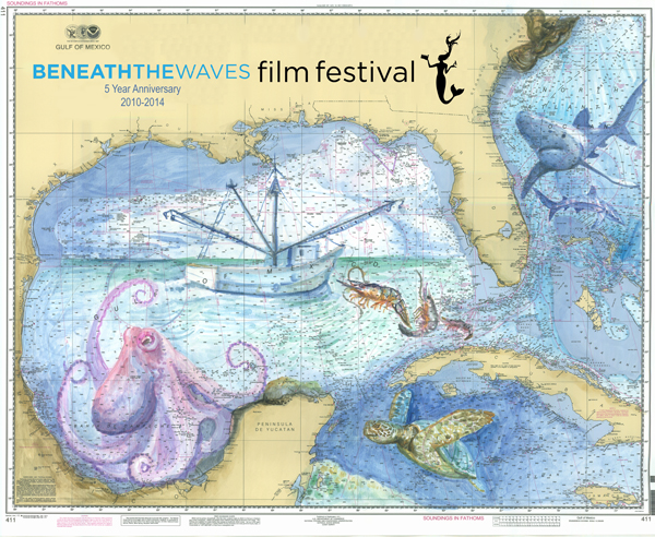 This is the official 5 Year Anniversary Beneath the Waves Film Festival Poster. This unique print features hand-painted marine life overlayed onto a NOAA map of the Southeastern US. Measures 16″x 20″. Poster signed by the artist, Carly Mejeur, and is shipped in a tube. $30 limited edition, price includes tax and shipping.